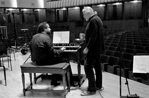 Conductor Paul Mann with Jon Lord during rehearsals for the Concerto for Group and Orchestra sessions at Liverpool Empire in June 2011.