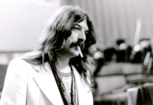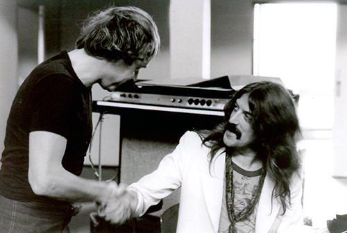 Another rare photo from the Sarabande sessions. Jon Lord greets Klaus Weber, Philharmonia Hungarica trumpet player. Behind is Jon’s custom Fender/Rhodes 73, used on tour in 1975.